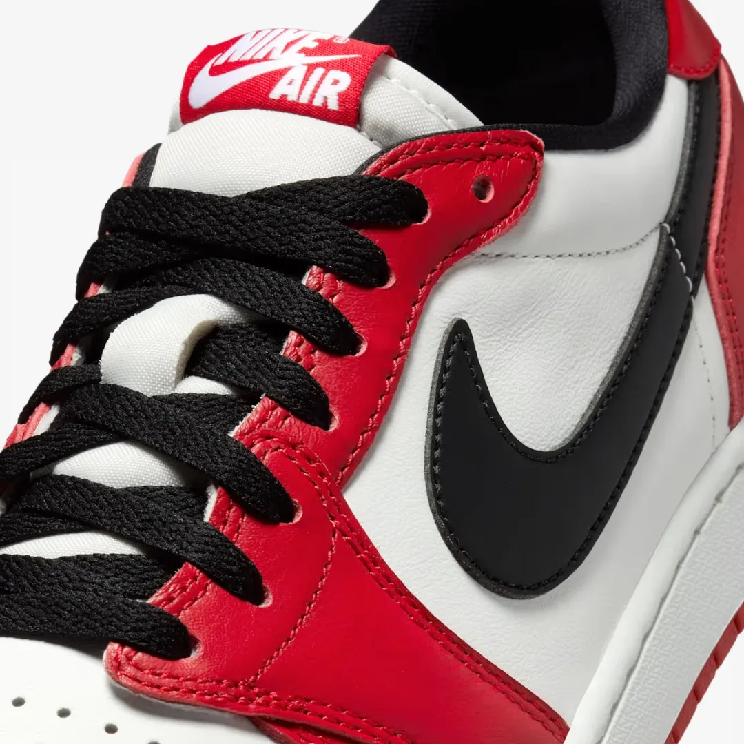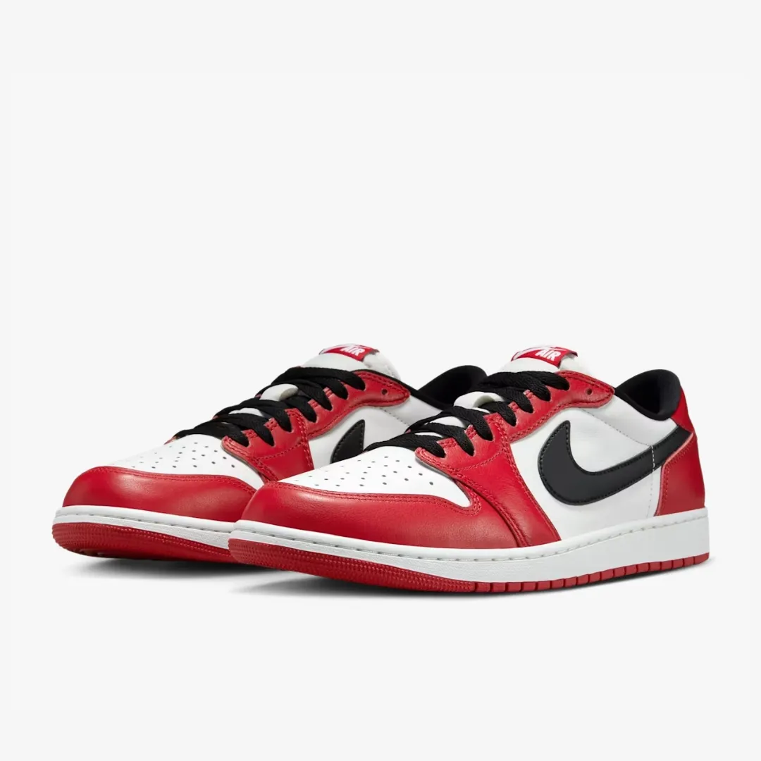 Nothing more iconic. Nothing more timeless. The AJ1 "Chicago" started something back in 1985. And 40 years later, the legacy continues. Giving a nod to the cultural icon, the low-top "Chicago" rendition first debuted in 2016. Grounded in the coveted colorway, this elevated iteration marks its triumphant return. The updated design includes premium Varsity Red and Summit White leather, with smooth black Swoosh logos. Oversized black Swoosh logos turn back the clock to the origins of MJ's all-time classic. The shoe that forever changed footwear continues to honor its enduring heritage—with Nike Air branding on the tongue and insole, and MJ's signature Wings logo stamped on the heel. Step into a revitalized relic of hoops and sneaker history. The "Chicago" is back.